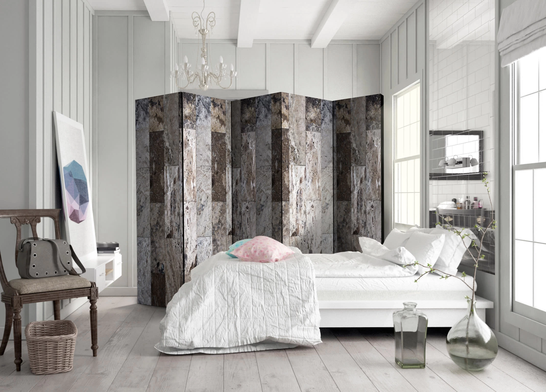 Dekoratives Paravent „Marble Mosaic II [Room Dividers]“ ist ein besonderes Schmuckstück für die modernen Inneräume. 5-teilig, hergestellt aus Holz und beidseitig bedrucktes Paravent teilt nicht nur diskret den Raum sonder kreiert auch in dem Raum ein fabelhaftes Arrangement. Perfekte Herstellung sowie originelle Motive in der Full HD Druckqualität verursachen, dass die Zimmerparavents jedem Raum einen einmaligen Charme verleihen. Die dekorativen Paravents für die Wohnung, dass ist mit Sicherheit eine originelle Idee für die Dekoration des Innenraumes. Es lohnt sich ihre praktische Anwendung zu erwähnen – die Zimmerparavents kann man z.B. zwecks der Kachierung des Wäschetrockners nutzen. Das Paravent ist eine sehr originelle Dekoration von Räumen, die man nutzen kann, sowohl in der Wohnung wie auch in einem Atelier z.B. im Friseursalon, Arztpraxis oder im Buchhaltungsbüro. Dekoratives Paravent bewährt sich ideal als:Als Zimmerparavent und ein dekoratives Möbelstück, dass den großen Salon vom Speisezimmer und Küche trenntIn einer Ein-Zimmer-Wohnung, in dem es den Tagesraum vom Schlafzimmer trenntAls Paravent für das Schlafzimmer, in dem es z.B. die Kleingarderobe heraustrenntIn Boutiquen und Kosmetiksalons, als orignelles Arrangement und Umkleideraum in Einem!Im gemeinsamen Geschwisterzimmer, als diskrete Trennwand für den RaumIn grossen Wohnungen und Lofts Technische Daten: