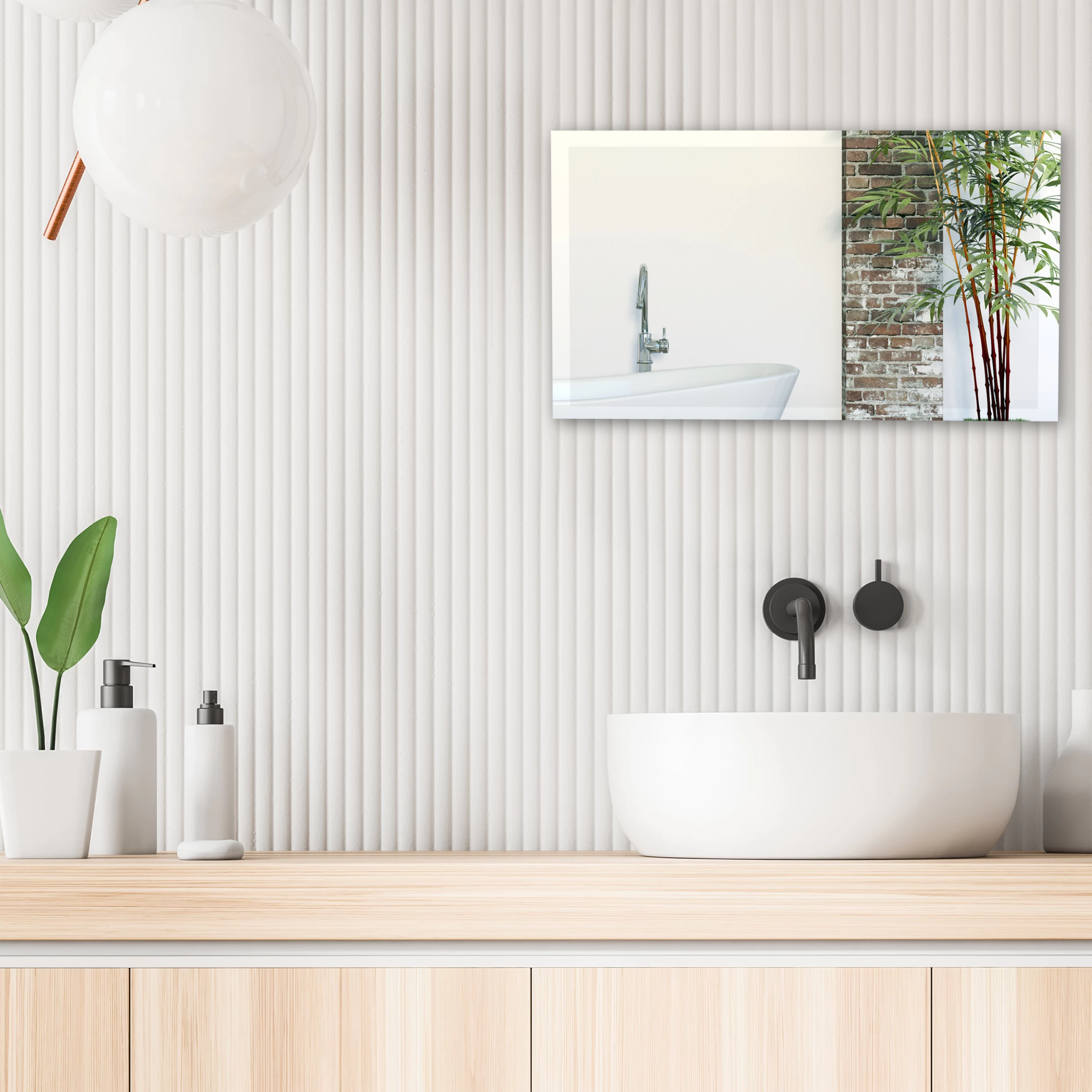 Minimalistisch und elegant zugleich fügt sich der eckige Hängespiegel in Ihre Einrichtung. Nutzen Sie Ihn als Schminkspiegel im Bad, als Wandspiegel im Gäste-WC oder als Eingangsspiegel im Flur, in den Sie vor Verlassen der Wohnung noch einen letzten Blick werfen können. Das rahmenlose Design und der ansprechende Facettenschliff lassen den Wohnspiegel besonders modern wirken. Dank der individuell anbringbaren Aufhängungen kann er sowohl im Hoch- als auch Querformat an der Wand montiert werden.