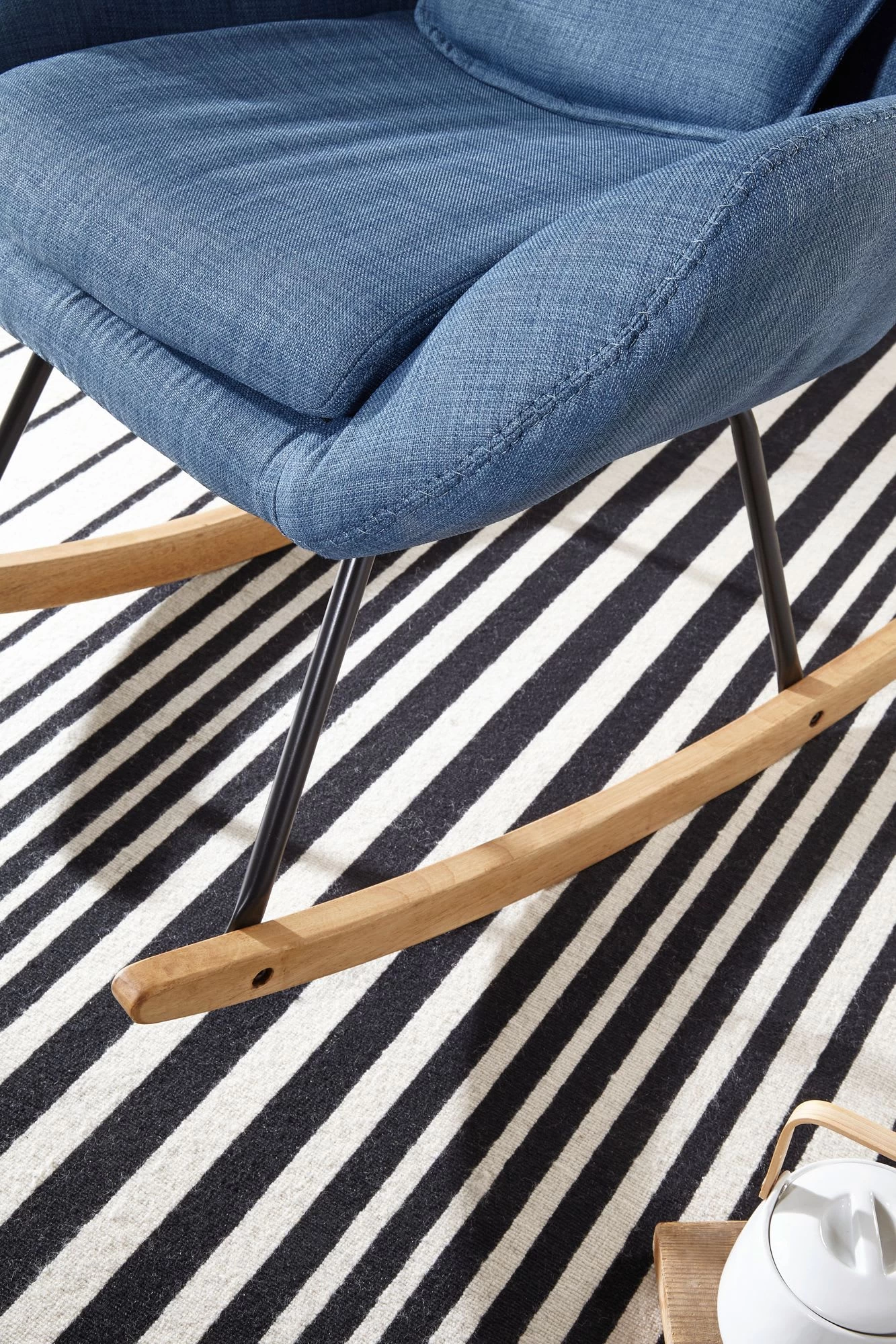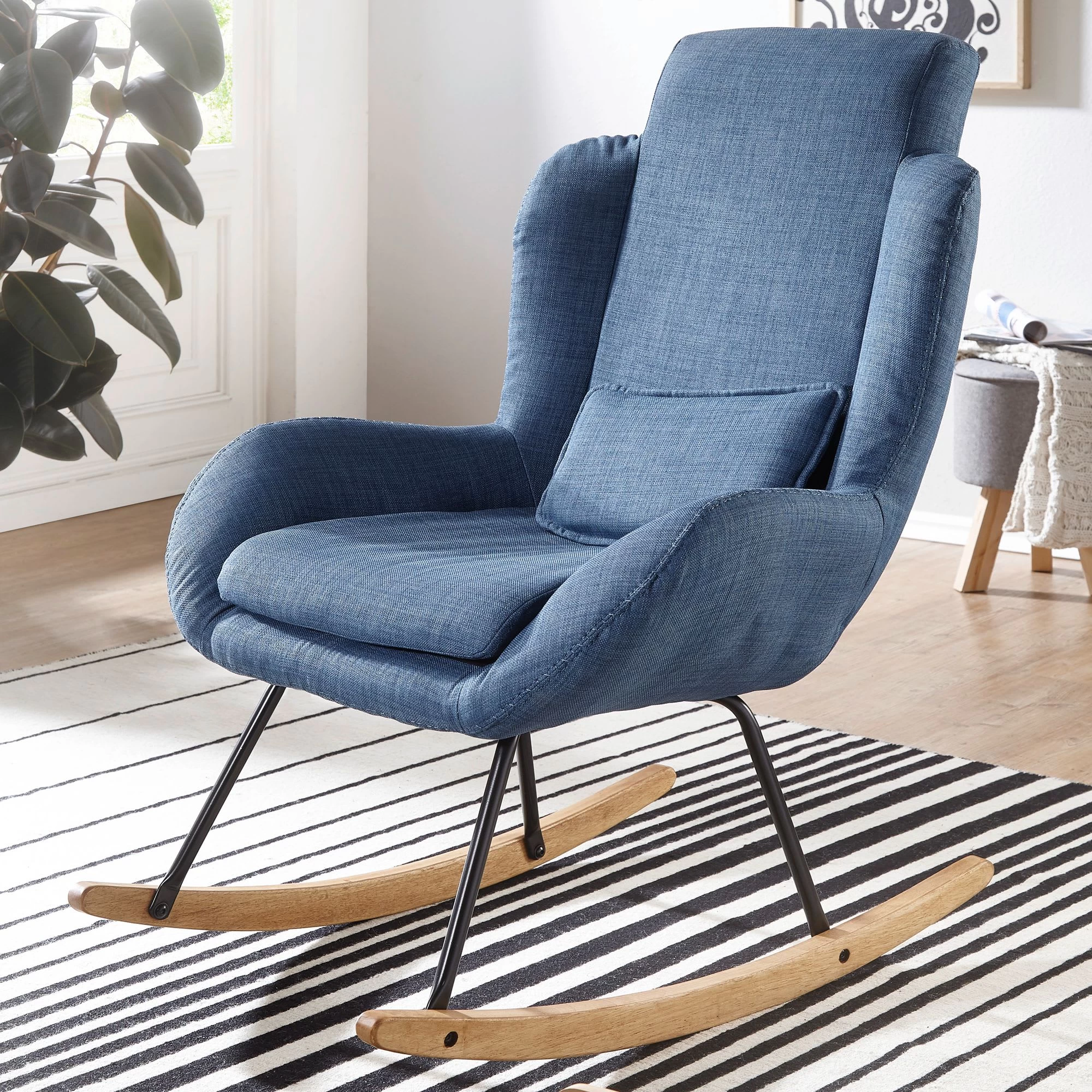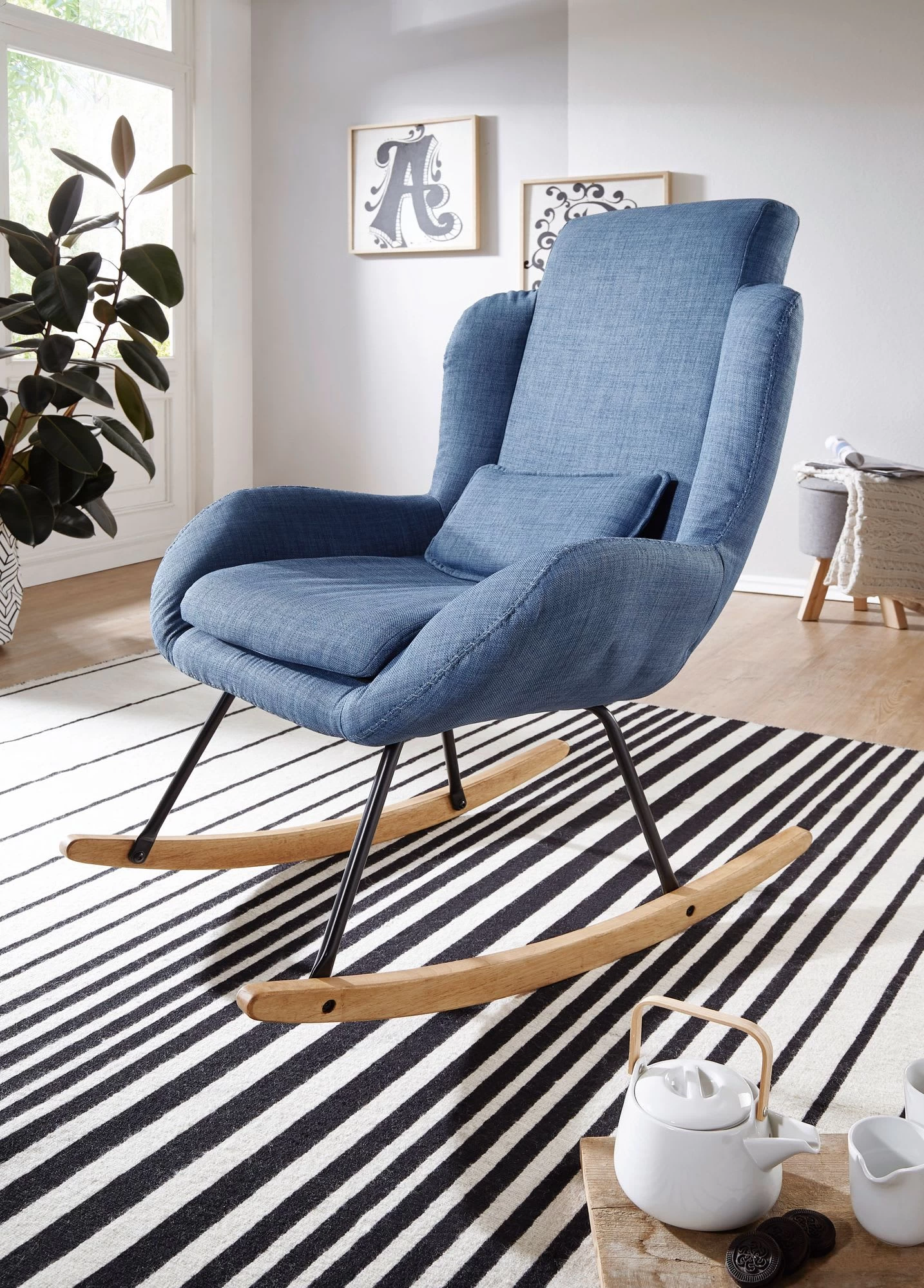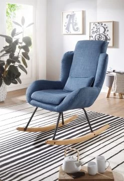 Design Gemütlicher Schaukelstuhl in modernem Design Extra weiche Sitzschale für gemütliche Stunden Wippfunktion aufgrund der gebogenen Holzbeine Abmessungen Breite: 75 cm Höhe: 110 cm Tiefe: 88,5 cm Sitzfläche (BxT): 44 x 52 cm Sitzhöhe: 50 cm Höhe Rückenlehne: 60 cm Maximalbelastbarkeit: 120 kg Besonderheiten Durch zwei Klettstreifen ist die Sitzpolsterung abnehmbar Das mitgelieferte Kissen lässt sich nach Belieben einsetzen, da es nicht fest verbunden ist Erhöhte Seitenflanken für ein angenehmes Sitzgefühl Aufgrund der hohen Rückenlehne lässt sich Ihr Kopf bequem anlehnen Material Schalensitz: Stoff Untergestell: Metall und Heveaholz Textilzusammensetzung Bezug: 100% Polyester Lieferumfang Ein Schaukelstuhl ohne Dekoration Montage Lieferung erfolgt zerlegt Leicht verständliche Aufbauanleitung wird mitgeliefert Informationen zu Heveaholz Das Holz des Heveabaumes ist schwer, es ist kaum anfällig für Feuchtigkeitsschwankungen und die Materialdichte und Härte ist vergleichbar mit dem Holz der Eiche. Pflegehinweise Wir empfehlen, frisch entstandene Flecken sofort mit einem Tuch abzutupfen. Bei einer Behandlung mit Natron kann das trockene Pulver einfach auf die betroffene Stelle aufgetragen werden. Bitte über Nacht einwirken lassen und am nächsten Tag das Natron mit einem Staubsauger absaugen.