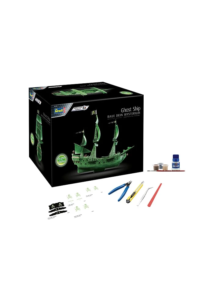 In 24 Tagen zum eigenen fertig-gebauten mysteriösen Geisterschiff. Mehrfarbige Teile. Kein Kleben. Inklusive Werkzeug und Zubehör für den Bau deines Traummodells. Echte Piraten bauen ihre Schiffe selbst! Stell dich der Herausforderung und baue mit dem Revell Adventskalender in 24 Tagen dein Traumschiff. Alles was du dazu benötigst ist enthalten und Weihnachten kannst du dann dein selbstgebautes Modell stolz in den Händen halten. Dieses Schiff erwacht erst bei Dunkelheit zum Leben. Das Ghost Ship verbreitet Angst und Schrecken wenn es im Dunkeln leuchtet. Mythen ranken sich um dieses Schiff. Den Leuchteffekt kriegst du Dank besonderer Farbe ganz einfach hin. Alles nötige ist in den 24 Türchen enthalten. Durch das innovative easy-click-system ist bei diesem Modell schneller Erfolg garantiert: Mehrfarbige, präzise gefertigte Bauteile werden durch einfaches Zusammenstecken stabil verbunden und mit Stickern dekoriert.