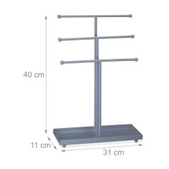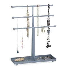 Mit dieser Schmuckhalterung gehören verhedderte Halsketten der Vergangenheit an. Mithilfe des Schmuckständers können unterschiedlich lange Ketten, Ringe, Armbänder und -reifen übersichtlich auf drei t-förmigen Stangen aufbewahrt und präsentiert werden. Zusätzlich verfügt der Schmuckbaum über eine Ablage, auf der Uhren, Ohrringe und Kosmetikartikel Platz finden. Dank der schlichten, zeitlosen Optik sorgt der Kettenorganizer für einen Hingucker im Schlafzimmer, Bad oder auf dem Schminktisch.
