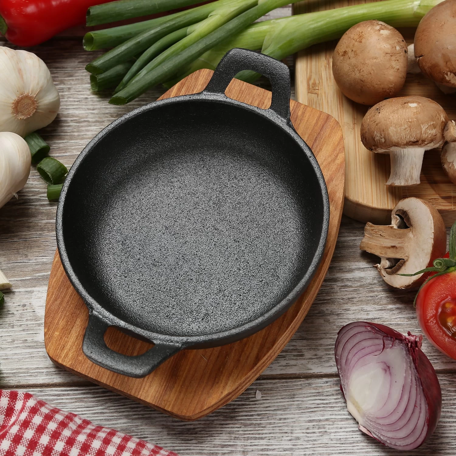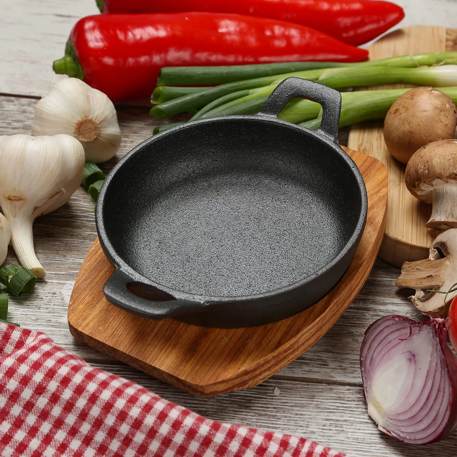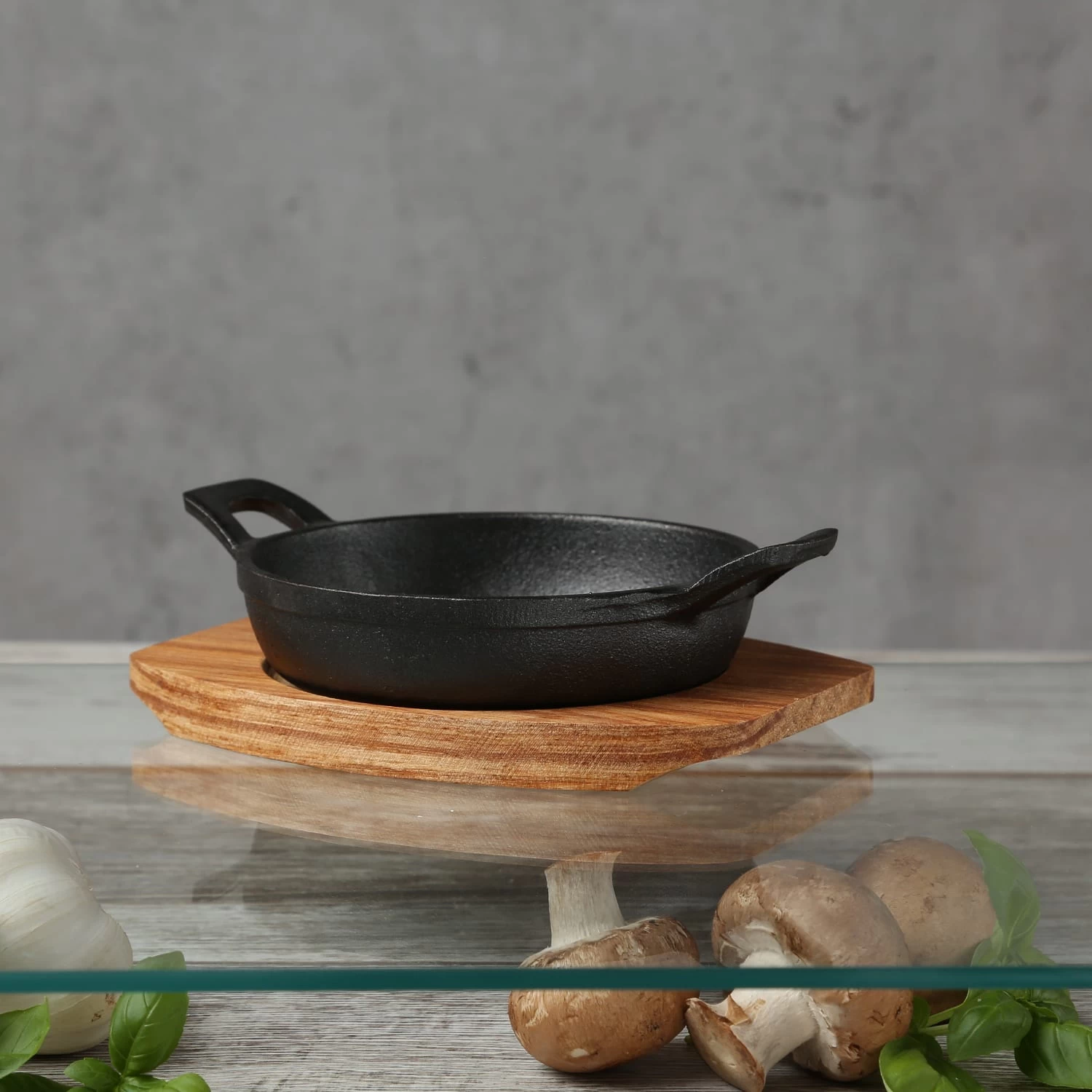 Minipfanne mit 2 Griffen u. Holzuntersetzer – Gusspfanne – Gusseisen – D: 12cm – Servierpfanne Kochen und Grillen am offenen Feuer wie es Menschen bereits seit Jahrtausenden tun – die ursprüngliche Art zu Kochen!