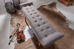 Design Stylische Stoffsitzbank in modernem Design Stimmiger Materialmix aus Massivholz und Stoff Üppige Polsterung für ein angenehmes Sitzgefühl Wunderschönes Chesterfield-Muster auf der Sitzoberfläche Eleganter Nietenrand führt um die Sitzfläche herum Abmessungen Breite: 125 cm Höhe: 51 cm Tiefe: 38 cm Höhe der Sitzfläche (Holz und Stoff): 10 cm Sitzhöhe: 46,5 cm Abstand Boden bis Bankunterseite: 36,5 cm Farbe Sitzfläche: Grau Beine: Braun Das Holz kann farblich vom Bild leicht abweichen, da es sich um ein Naturprodukt handelt Besonderheiten Fester und stabiler Stand dank der robusten Massivholzbeine Sehr weiche Polsterung sorgt für ein angenehmes Sitzgefühl Hochwertiger & strapazierfähiger Sitzbezug aus Stoff Anti-Rutsch-Noppen an den Fußenden schützen Ihren Fußboden vor Kratzern In liebevoller Handarbeit gefertigt – daher ist jedes Stück ein Unikat Empfohlene Maximalbelastbarkeit: 200 kg Material Sitzflächenbezug: Stoff Beine: Mango Massivholz Nieten: Metall Textilzusammensetzung Sitzflächenbezug: 100% Polyester Lieferumfang Eine Stoffbank ohne Dekoration Montageanleitung und -material liegen der Lieferung bei Montage Lieferzustand: teilmontiert – lediglich die Beine müssen angebracht werden Pflegehinweise Die Oberfläche des Holzes mit einem lauwarm angefeuchteten Baumwolltuch reinigen. Empfehlung für den Stoff: einen milden Polsterreiniger verwenden, um Flecken zu entfernen. Keine Scheuermittel, scharfen Reinigungsmittel oder tropfnassen Tücher verwenden.