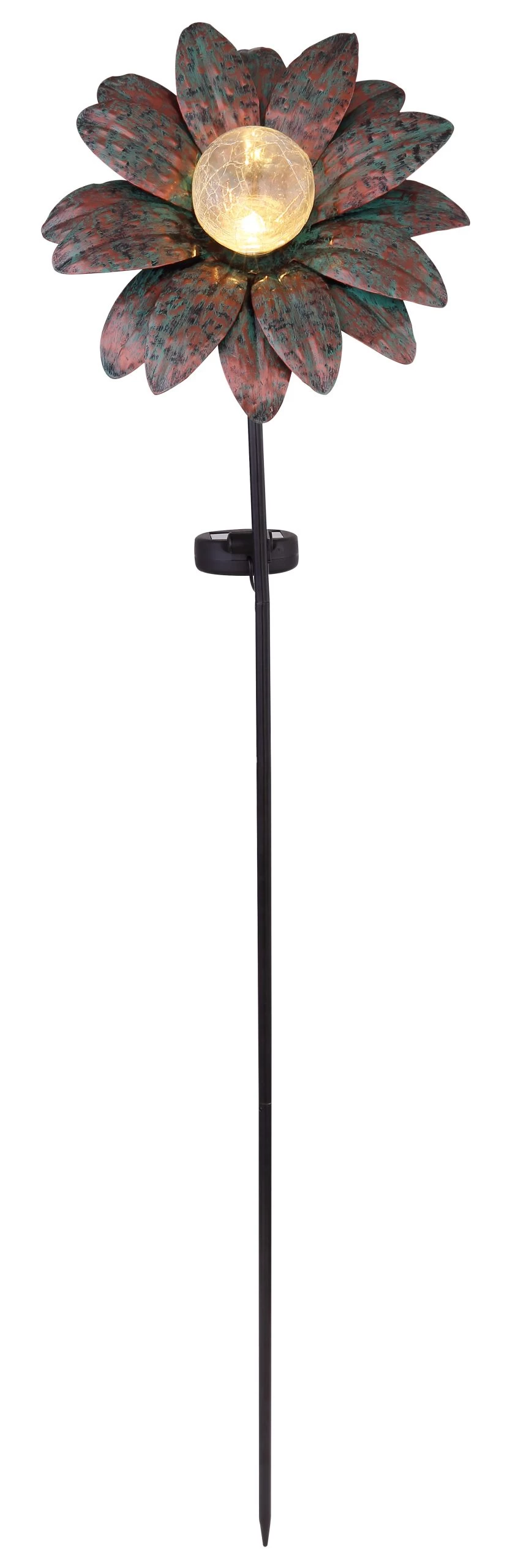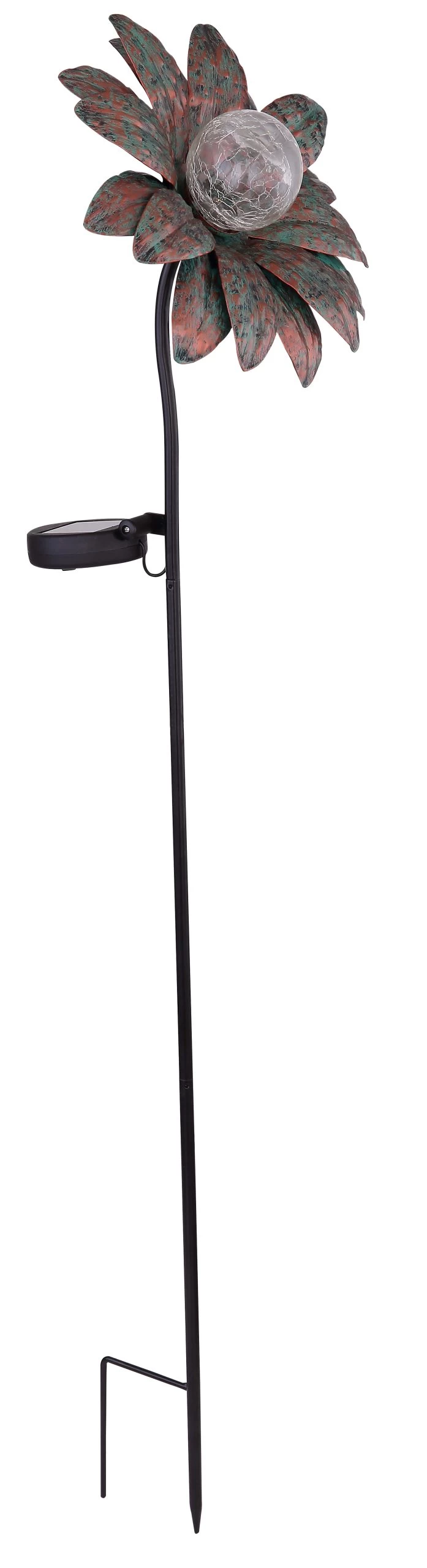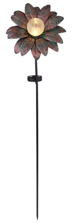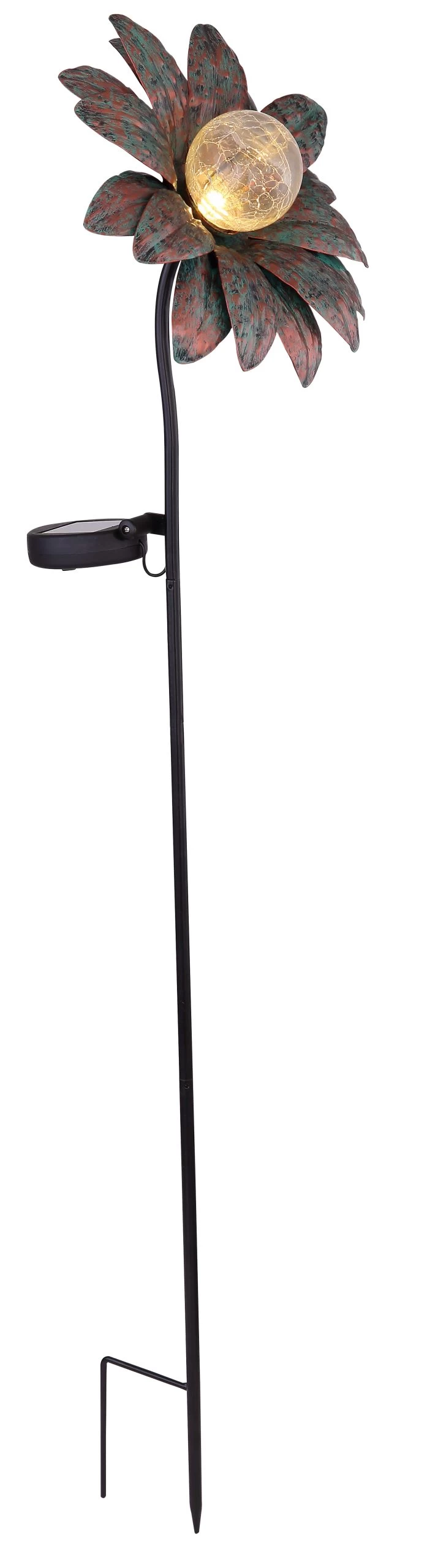 Solarleuchte Metall rostfarben, grün, Glas crackle, Schiebeschalter, Akku inkludiert AAA 300mAh 1.2V, IP44, Erdspitz mit Blume, LxBxH: 210x110x900mm, inkl. LED 0.06W 3V, 3000K