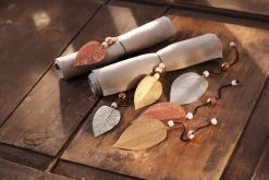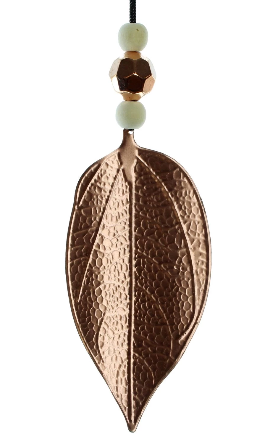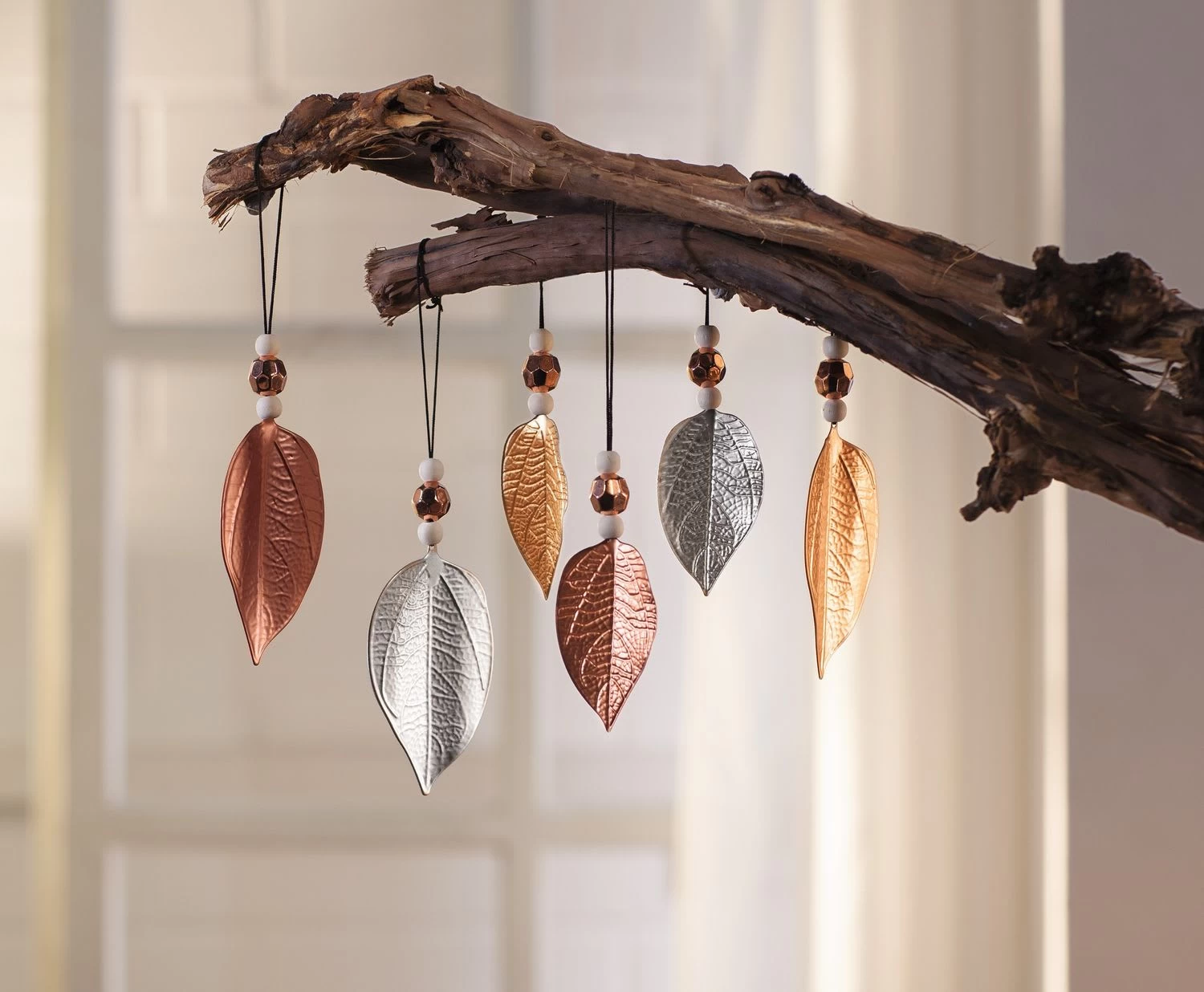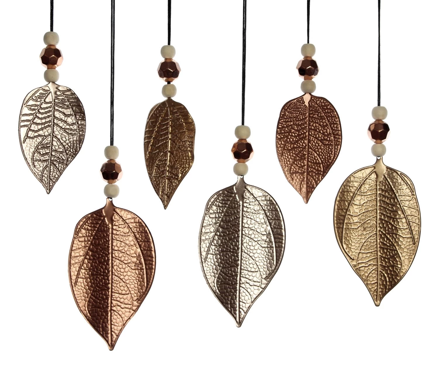trendige Blätterdeko in angesagtem Metallic-Look, lackiertes Metall, aufwändig mit Blattadern verziert, schwarze Schnur mit Holz- und Kunststoffperlen dekoriert