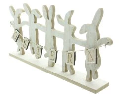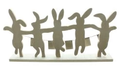 fröhlich tanzende Hasen aus MDF, naturfarben, Girlande mit Ostern-Schriftzug