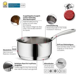 Stielkasserolle Flavoria aus Edelstahl in glänzender Optik – Diese hochwertig verarbeitete Stielkasserolle glänzt nicht nur optisch, sondern bietet eine ganze Reihe nützlicher Eigenschaften. Beispielsweise ermöglichen 2 praktische Ausgießnasen ein topffreies Ausgießen. Auch die praktische Innenskalierung und ein Energiesparboden bieten definitiv einen Mehrwert. Geeignet ich dieses Kochaccessoire für alle Herdarten! Stielkasserolle Flavoria 2,6 Liter mit 20 cm Durchmesser.