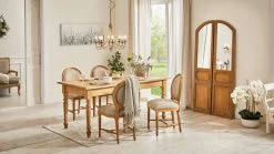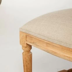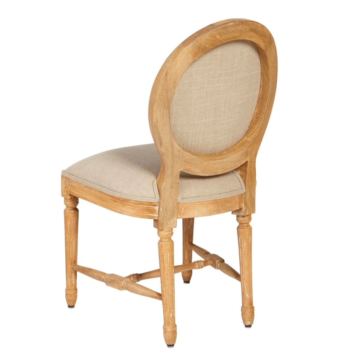 Zwei Esszimmerstühle im Set. Ausgestattet mit weichen Polstern aus dichtem Schaumstoff und einem Bezug aus beigen Baumwollstoff, bietet er ihnen einen hohen Sitzkomfort. Mit der Kombination aus Holzschnitzereien und rundem Design bringen diese Stühle Eleganz und Stil in ihr Wohn- und Esszimmer.