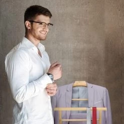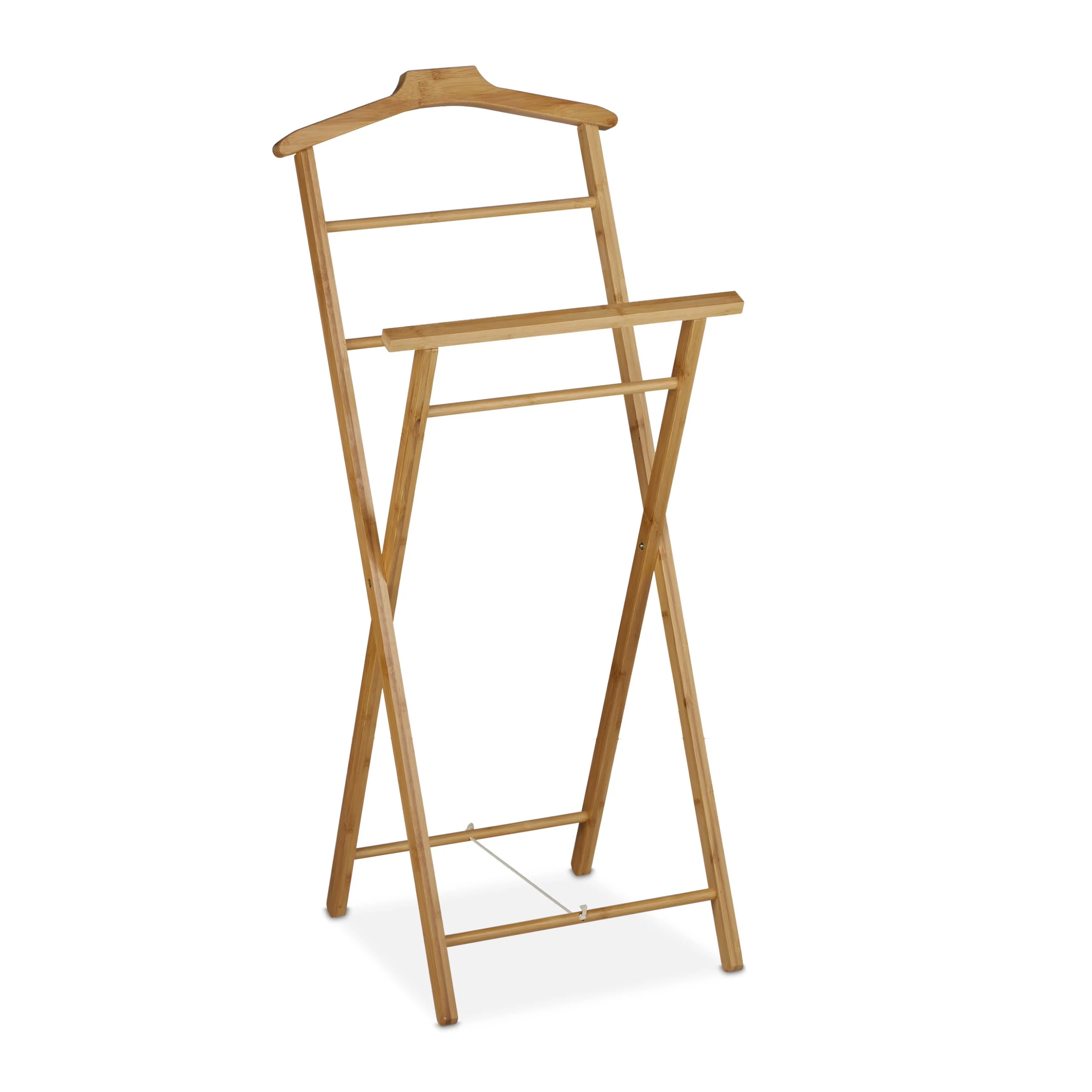 Diese praktische Kleiderablage aus Bambus hält Anzüge knitterfrei und hilft Ihnen bei der Zusammenstellung Ihres Outfits. Auf einem Kleiderbügel und einer Hosenstange bietet der freistehende Kleiderständer Platz für Jacketts, Hemden, Röcke und Hosen. Ob für das Alltagsoutfit oder die Garderobe zum besonderen Anlass, der Kleiderbutler hält Ihre Kleidungsstücke übersichtlich und faltenfrei beisammen. Bei Nichtgebrauch kann der Herrenständer zusammengeklappt und platzsparend verstaut werden.