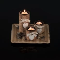 Mit dem Dekokerzenset zauberst Du im Handumdrehen eine gemütliche Atmosphäre in Deinem Zuhause. Das quadratische Kerzentablett eignet sich hervorragend als Tischdekoration für Esstafeln, macht aber auch der Fensterbank, einem Beistelltisch oder einer Kommode eine gute Figur. Das warme, flackernde Kerzenlicht schafft überall stimmungsvolles Ambiente. Die Holzoptik verleiht der Kerzendeko einen heimeligen Flair, während die Schleifen- und Herzverzierungen für einen romantischen Touch sorgen.