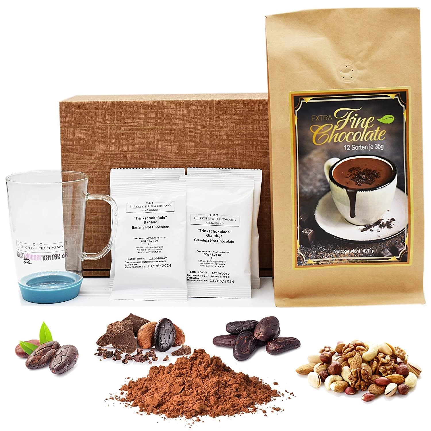 Trinkschokolade Kakao Geschenk-Set mit 12x Sorten italienischer Trinkschokolade + gratis Trinkglas