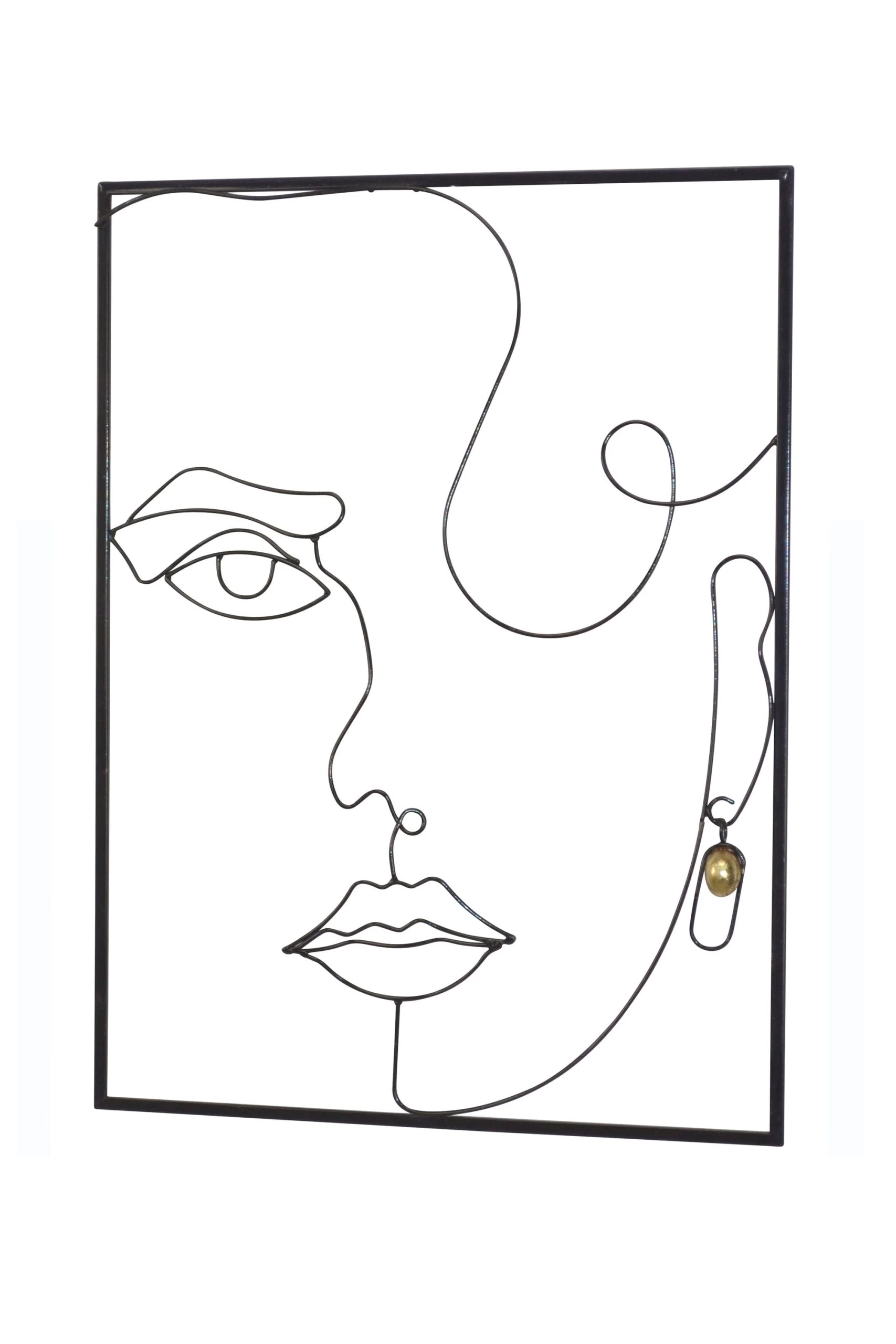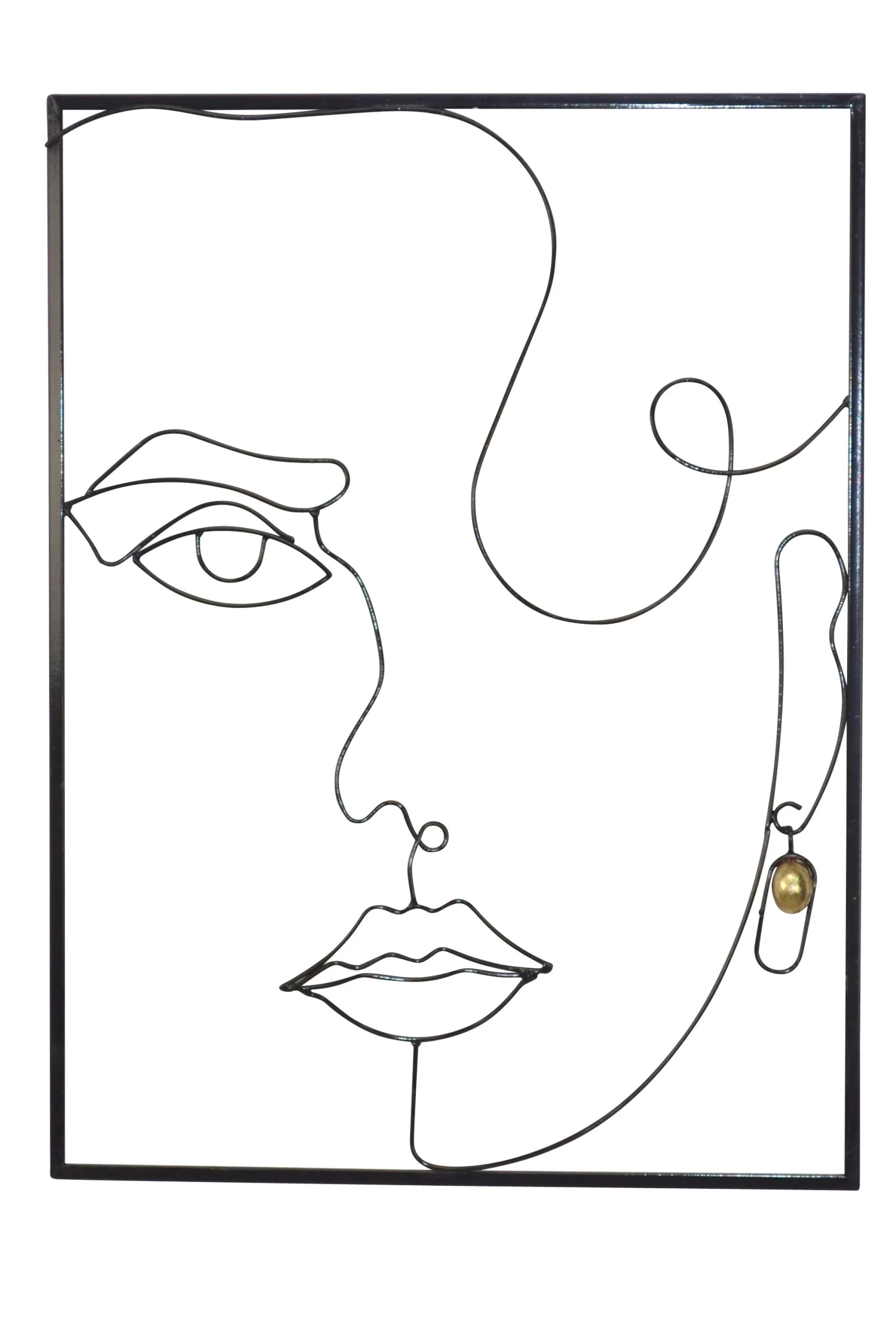 Modernes Wandbild aus Metall mit einem schwarzen Rahmen, pulverbeschichtet. In der Mitte ist ein „Gesicht“-Motiv modern und abstrakt eingeareitet. Motiv schwarz mit goldfarbenen Ohrring. Zur Wandmontage. Maße ca. cm: (B/H/T) 50/67/3