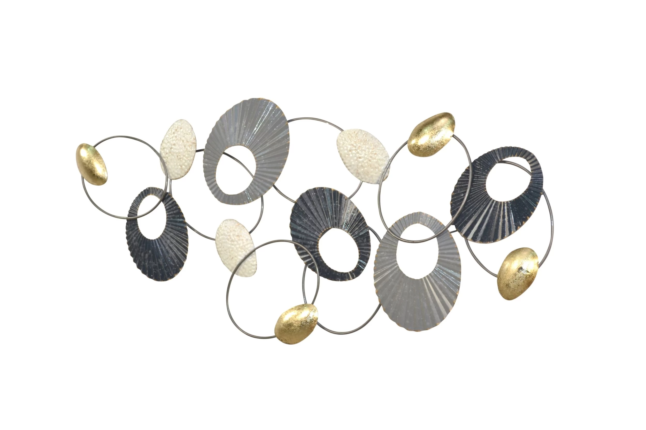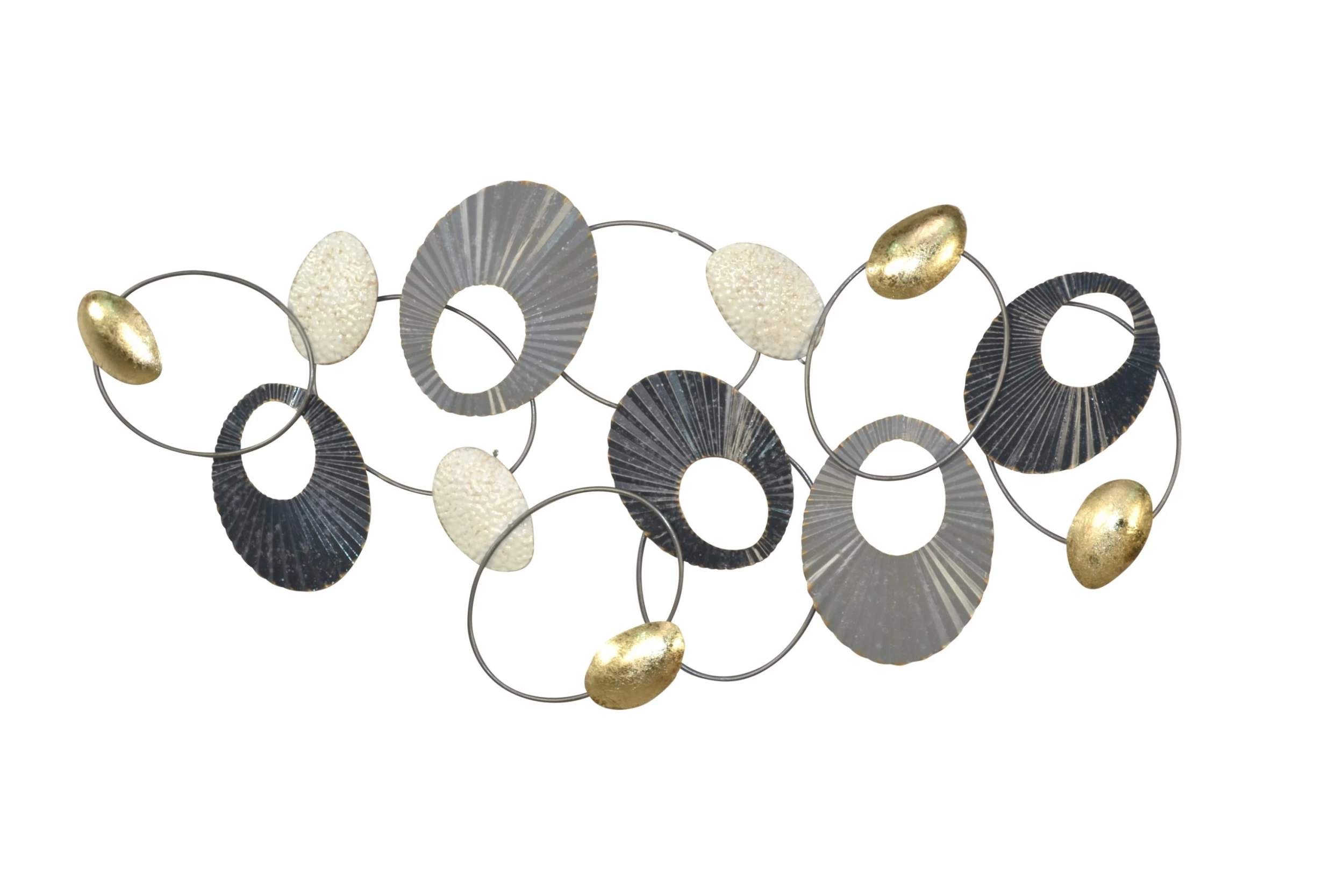Schöne, große Wanddekoration aus Metall, die mit unterschiedlich großen, runden bzw. ovalen Ringen/Motiven und Oberflächenstrukturen gearbeitet sind, die trendig farbig in gold/creme/anthrazit/grau lackiert sind. Gesamtbreite ca. 121 cm, Höhe 56,5 cm, Tiefe 6,4 cm. Diese schöne Wanddekoration ist ein Blickfang im gesamten Wohnbereich, ob über einem Sideboard oder ihrer Wohnlandschaft.