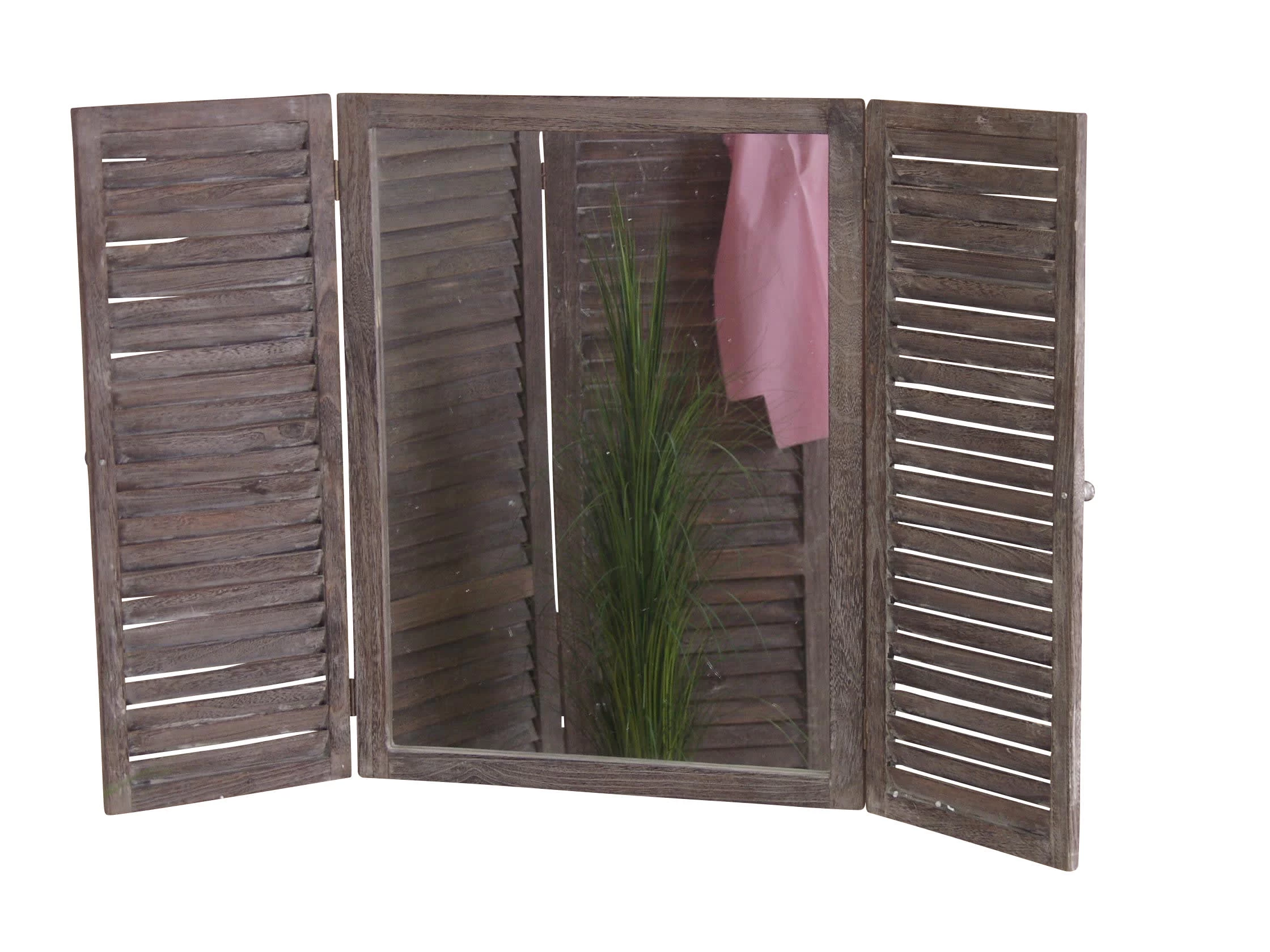 Wunderschön gearbeiteter Vintage-Spiegel aus Massivholz Paulownia „Blauglockenblütenbaum“ mit aufklappbaren Lamellenfronten a`40 cm breit. Die aufklappbaren Lammellenfronten sind antik braun gebeizt und lackiert, im trendigen used-look, mit gewollten, herausgearbeiteten Gebrauchsspuren an der Holzoberfläche. Spiegelfläche ca. 55 x 75 cm.