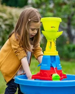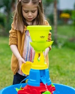 Plitsche plantsch! Hier kommt das Wasservergnügen für den Garten. Mit dem kunterbunten myToys „Wasserspieltisch“ ist Spielespaß garantiert. Durch den großen Trichter kann ganz einfach Wasser eingefüllt werden, das dann durch verschiedene Öffnungen in der Säule herausplätschert. Die Schale fängt das Wasser auf und die vielen Utensilien können jetzt nach Herzenslust eingesetzt werden: Mit dabei sind ein Krebs- und ein Krokodil-Förmchen, ein Becher, verschiedene Schaufeln und ein Schiff für lustig-wilde Abenteuer-Fahrten im Wasserbecken. In der Mitte und am unteren Teil der Säule läuft das Wasser über ein fröhliches Wasserrad in das Becken. Das Becken schließt mit drei Stöpseln, die bei Bedarf herausgenommen werden, um das Wasser abzulassen. Vergnüglicher Plantsche-Spaß für die Kleinen! Der myToys „Wasserspieltisch“ lässt sich komplett auseinandernehmen und so ganz Platz sparend unterbringen.