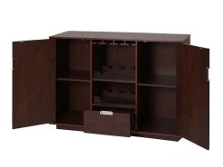 Aufgeklappt bietet der Schrank jede Menge Platz für alkoholische Getränke, Säfte, Gläser, Snacks und weiteres Zubehör. So haben Sie alles zur Hand um Knabberzeug zu servieren oder einfach eine gute Flasche Wein zu öffnen. Eine funktionale, kleine Hausbar, die noch einen eleganten Akzent in Ihrer Wohnung setzt.